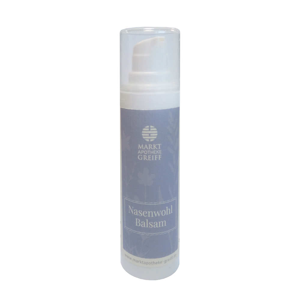 Der wohltuende Nasenwohlbalsam der Markt-Apotheke Greiff  hilft mit seinen ätherischen Ölen wie Eucalyptus, Ravintsara und Kamille wieder Durchzuatmen und kann daher zur Pflege bei empfindlichen Schnupfennasen eingesetzt werden.